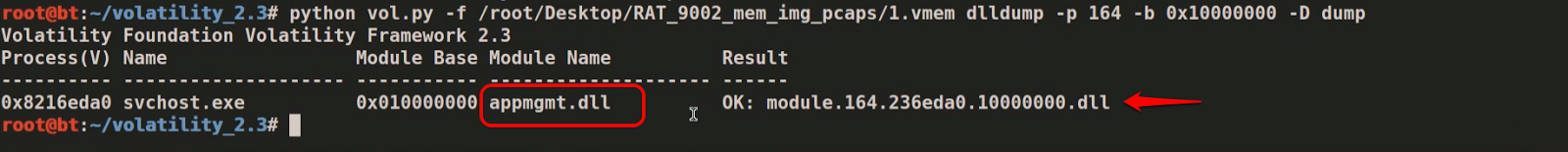 after dumping this DLL (appmgmt.dll) from memory and submitting to VirusTotal, AntiVirus vendors detect this as (McRat/Mdmbot) which is same as RAT 9002