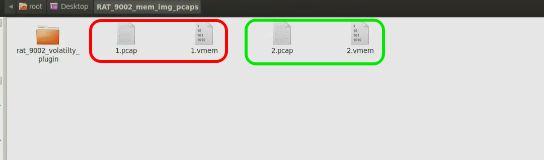 I analyzed few 9002 RAT samples (104130d666ab3f640255140007f0b12d and acbc249061a6a2fb09271a68d53567d9) in the sandbox and collected the pcaps and the memory images. Below screenshot shows the pcaps and the memory images collected after running the samples in the sandbox. The one shown in the red is the pcap and memory image after running the first RAT 9002 sample and the one in green is the pcap and memory image collected after running the second sample