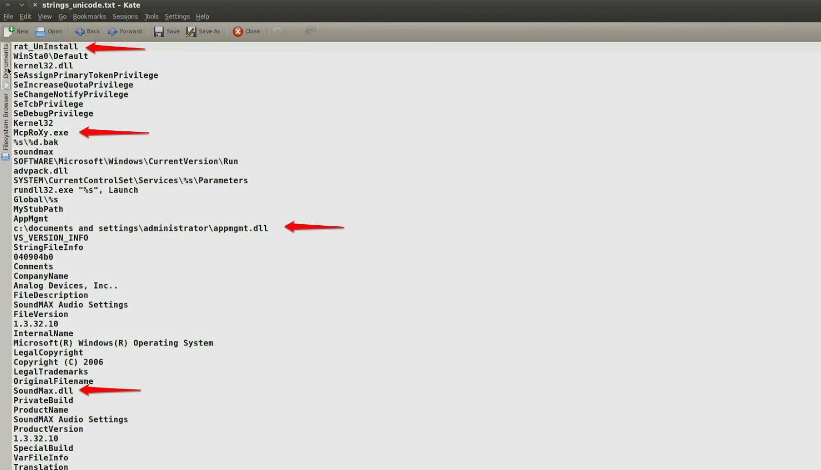 ASCII and Unicode strings from the dumped DLL shows the presence of the RAT 9002 indicators (rat_UnInstall, McpRoXy.exe and SoundMax.dll). This further confirms that the dumped DLL is component of RAT 9002
