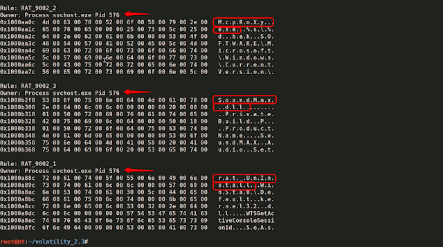In order to automatically determine the RAT 9002 infection in the memory, I wrote a Volatility plugin (rat9002.py) which narrows down on the malicious process by searching for the RAT 9002 artifacts in memory. Below screenshot shows the volatility plugin and the indicators (rat_UnInstall, McpRoXy.exe and SoundMax.dll) that are present in the variants of RAT 9002 (as mentioned in the FireEye blog) which can be used to determine the infection in memory.