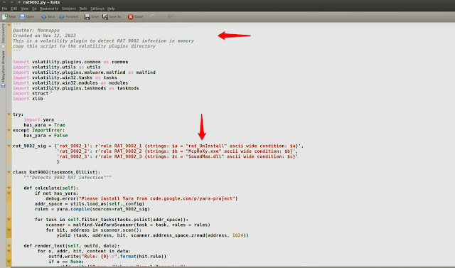 infection. In order to do that i analyzed few samples of the 9002 RAT and also based on some of the information mentioned in the FireEye blog, I wrote a Volatility plugin to detect RAT 9002 infection in Memory.