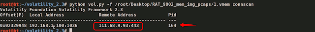 Running the connscan module also confirms that the malicious communication to the ip 111.68.9.93 on port 443 that we saw in the pcap is associated with svchost.exe (with pid 164)